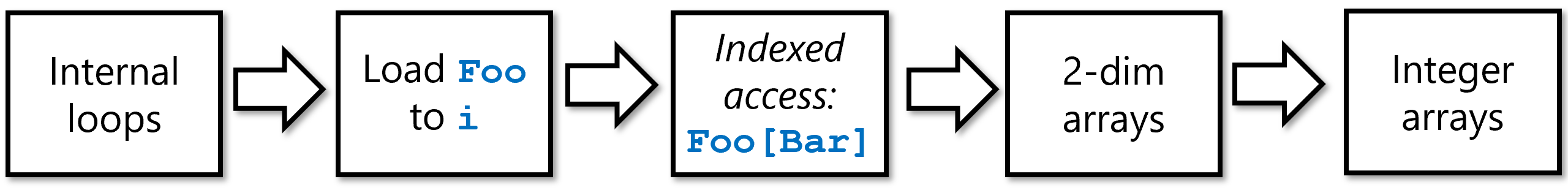 Setindex(Bar), 使得如果Bar是编码了某个整数的数组, 则在执行Setindex(Bar)后,i的值将等于 这将允许我们通过Setindex(Bar)后跟Foo[i]来模拟Foo[Bar]这种形式的语法. - 二维位数组: 接着, 我们展示如何使用“语法糖“来为NAND-TM增加二维数组的功能. 即, 拥有两个索引