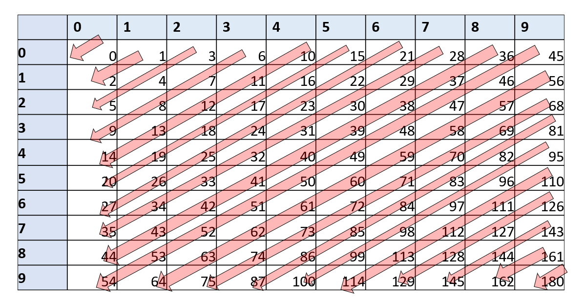 为了实现二维数组, 我们希望将它们嵌入到一个一维数组中. 思路是通过一个一一对应的函数 从而将二维数组Two中的位置嵌入到一维数组One的位置中.