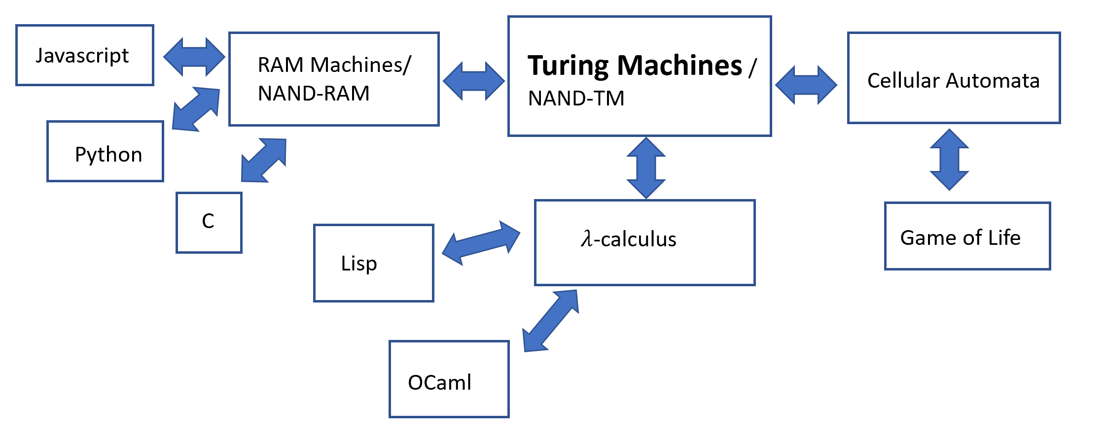 - 虽然我们使用图灵机定义了可计算函数, 但我们同样可以使用许多其他模型来定义, 不仅包括NAND-TM程序, 还包括RAM机, NAND-RAM, λ演算, 细胞自动机和许多其他模型.
